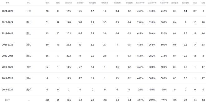 如今小塔克去了海外联赛,也许仍有机会重返NBA,可通常情况是离开了就很难回来,这哥们整个生涯常规赛场均出战19.5分钟,贡献9.2分2.6板2.8助,三项命中率42.7%、29.9%和77.1%;季后赛则是场均出战10.8分钟,得到6.7分3.2板。